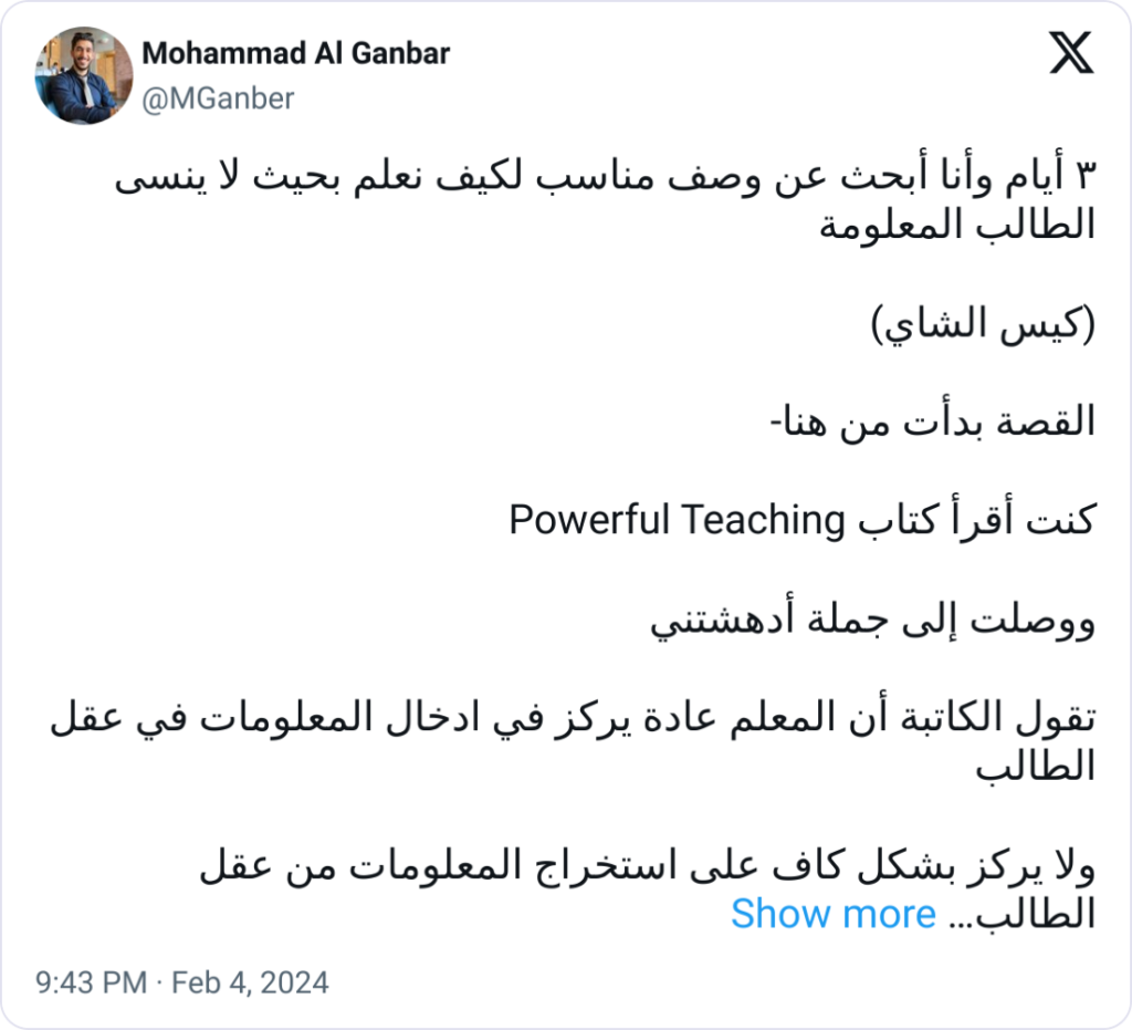 خلاصة التغريدة هي أن عملية التعلم تحدث عند إدخال المعلومات في ذاكرة الطالب، وعند استرجاعها من ذاكرته.